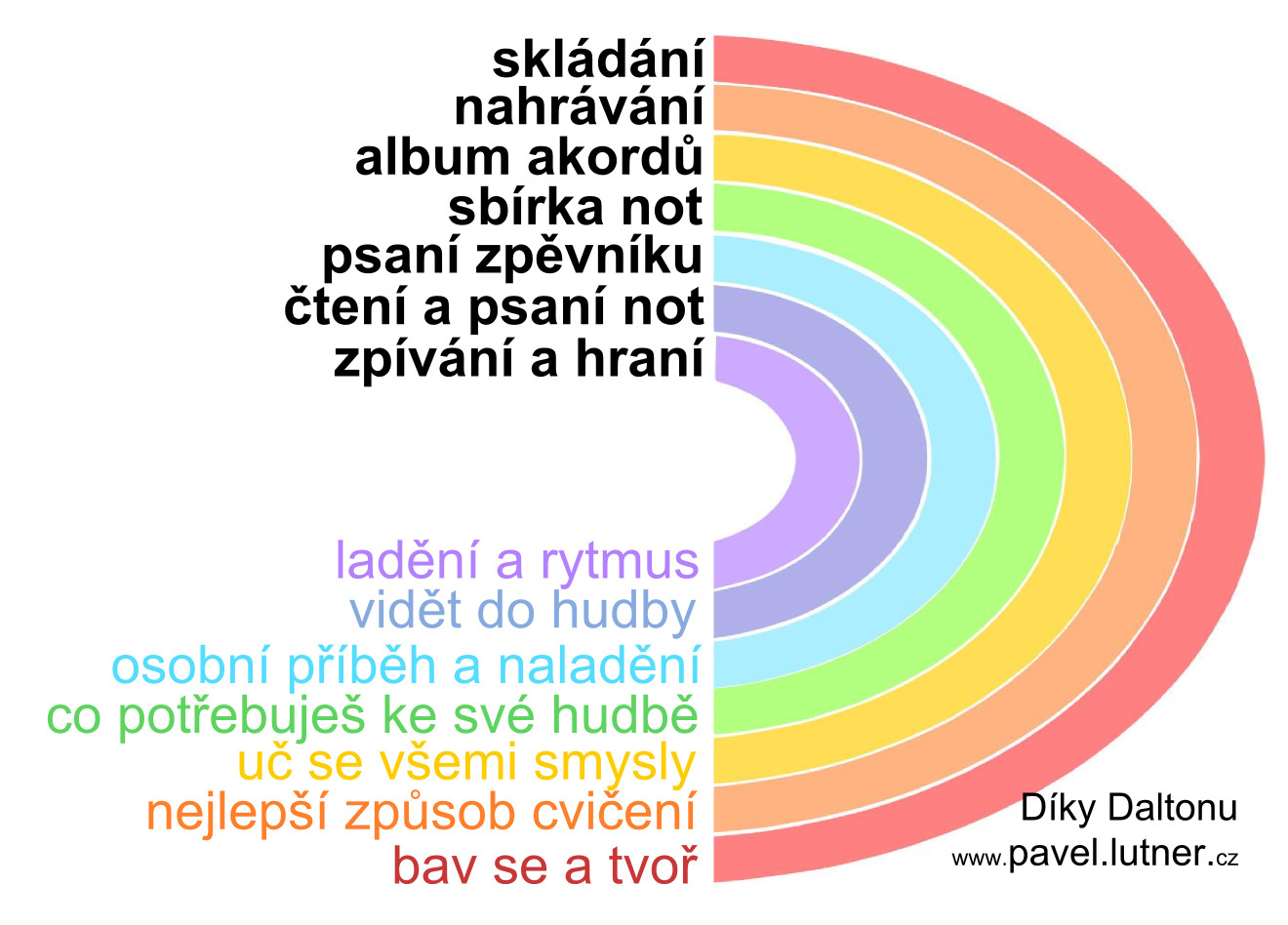 Nadšení „daltonem“ pokračuje. Jsem rád, že se povedlo rozpracování myšlenek daltonu do běžného života mých mimoškolních hudebních aktivit s dětmi, rodiči i hráči Kytarového klubu. Tady je pár grafik k tomu. Mějte se krásně. Pája